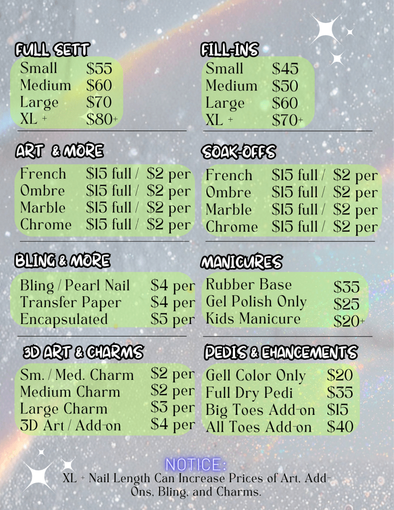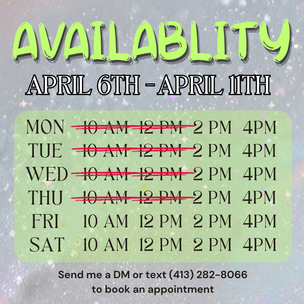 2. Text (413) 282-8066 with your Name and dates/times you are looking to book. As well, please include what services and designs you are looking to book.